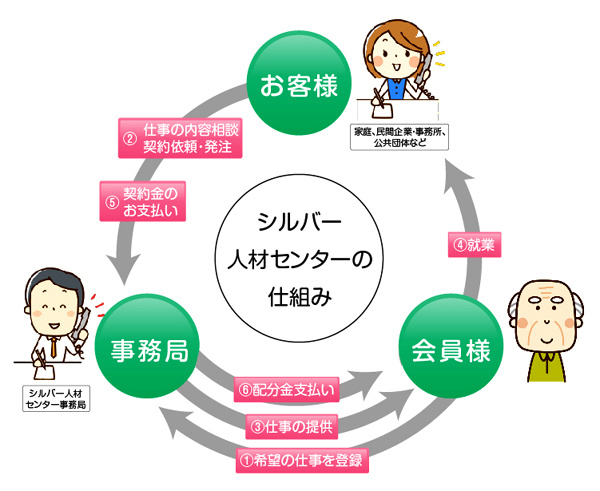 シルバー人材センターと発注者(お客様)との間で請負または委任契約を結びます。発注者(お客様)と会員との間には雇用関係をはじめ如何なる契約も成立しません。